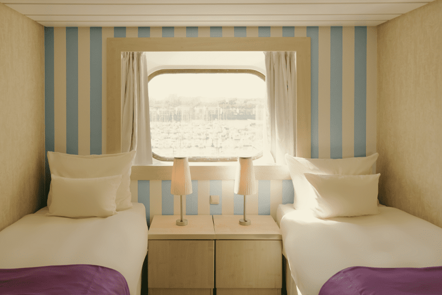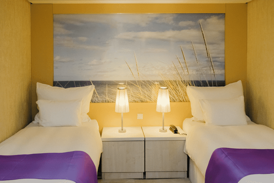 Welcome to the cosy comfort of an Inside Cabin. Relax in your private space, complete with all the amenities you need for a memorable voyage. This cabin type features two twin beds that are easily convertible to a double bed for flexibility.
